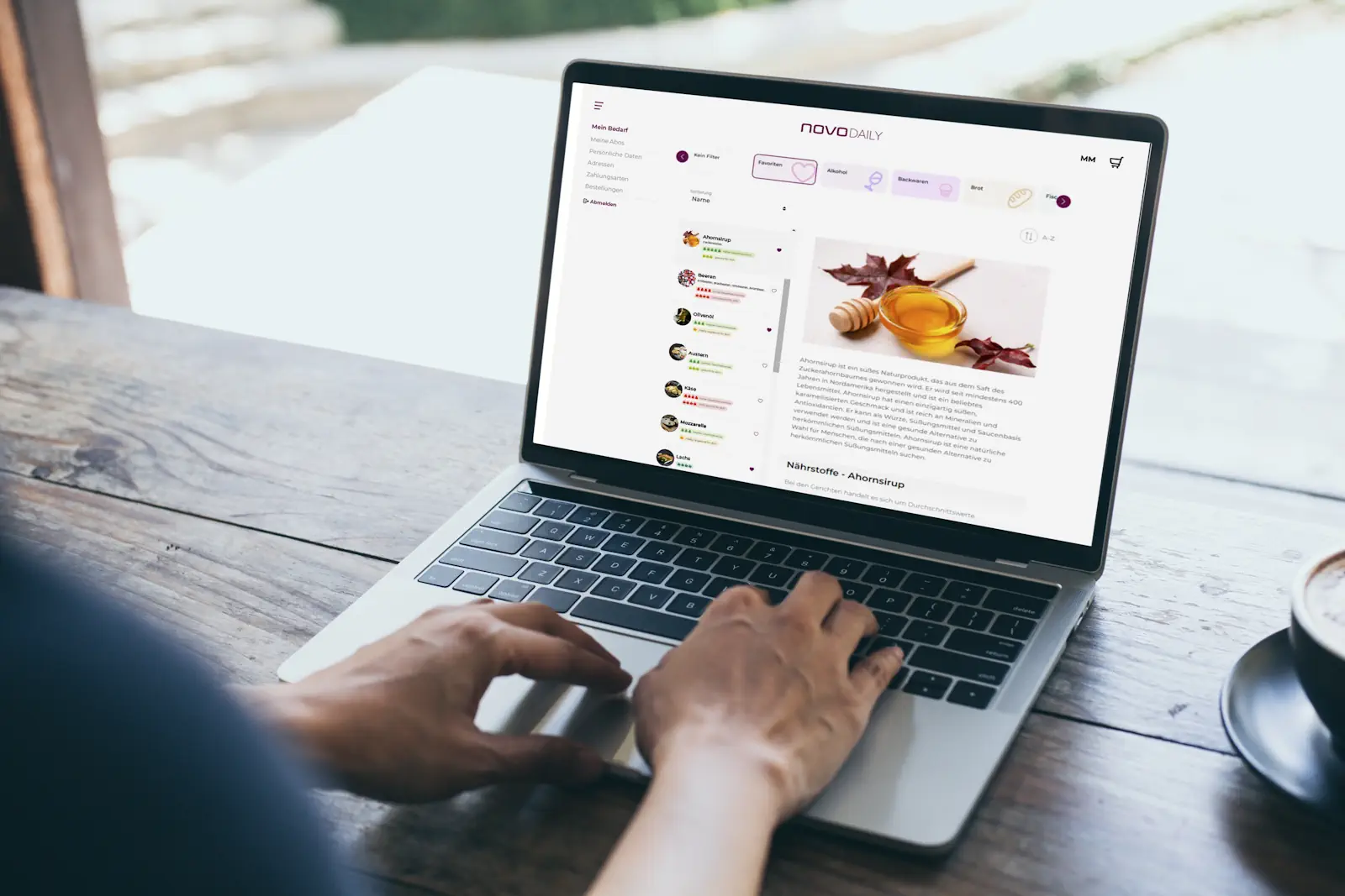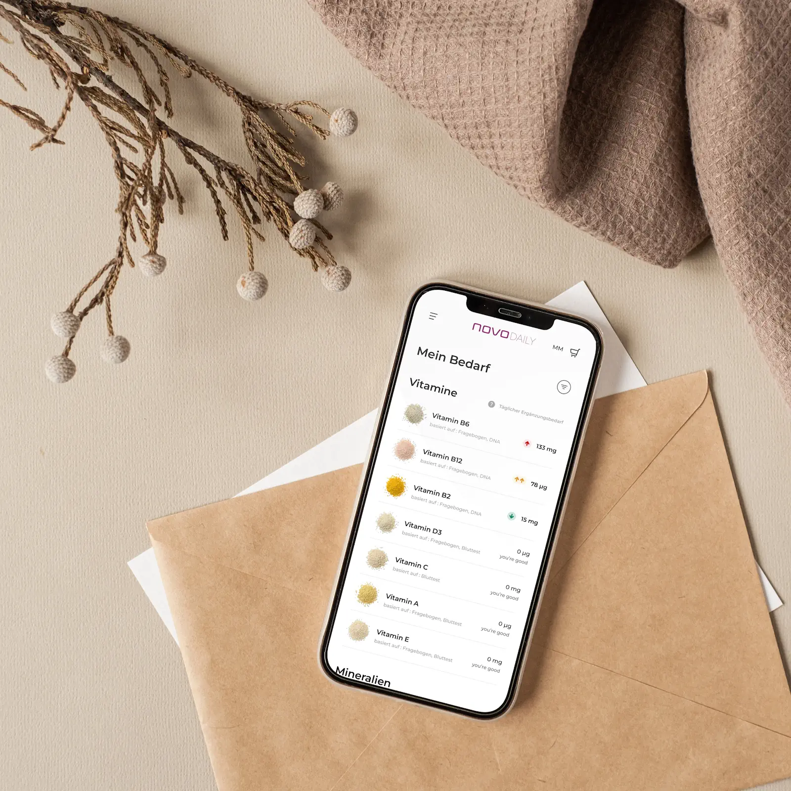 Logge dich jederzeit bei NovoDaily ein, um dich über deinen aktuellen Bedarf zu informieren. Basierend auf deinen Antworten auf unseren Fragebogen: Wie hoch sollte die Dosis von Vitamin B12, C, D3 und vieler weiterer Nährstoffe sein? Und ganz wichtig: Hier findest du die Übersicht von über 900 Lebensmitteln, die wird individuell für dich ausgewertet haben. Von welchen solltest du mehr zu dir nehmen, welche solltest du eher reduzieren?