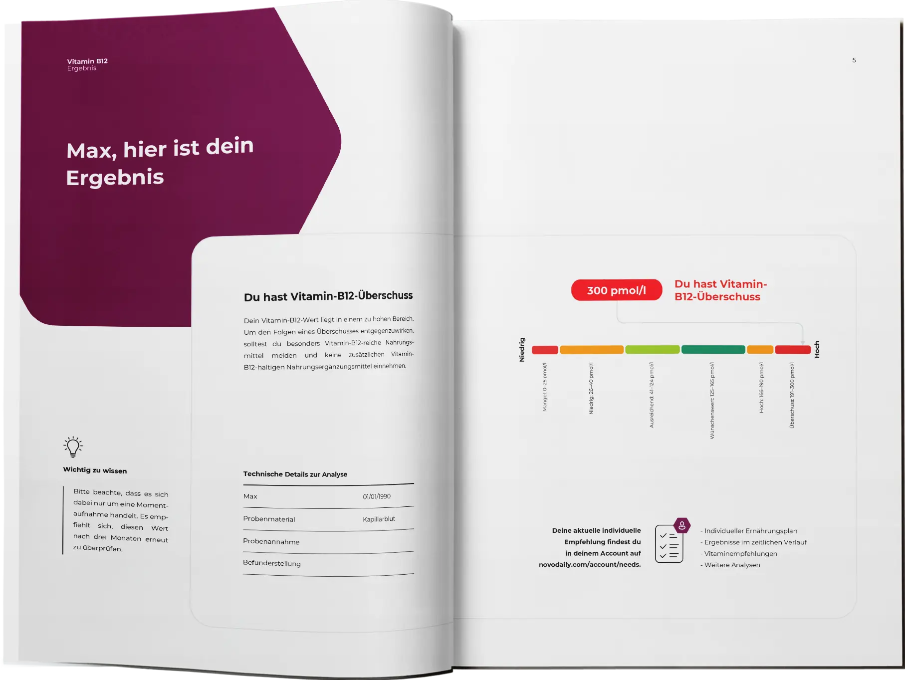 Vitamin B12 ist ein lebensnotwendiges, wasserlösliches Vitamin. Ein Mangel kann das Nervensystem beeinträchtigen und eine Anämie verursachen. Durch die Messung von Holotranscobalamin, der aktiven Form von Vitamin B12 im Körper, stellen wir fest, ob du ausreichend mit diesem Vitamin versorgt bist.